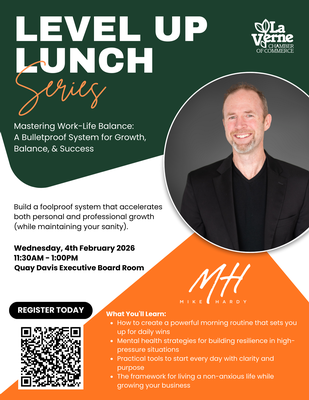 Level Up Lunch is the launch of a new look for the La Verne Chamber Luncheon series. This event will feature a variety of dynamic speakers discussing various topics of interest to the business community.